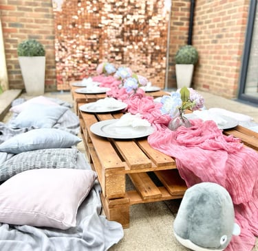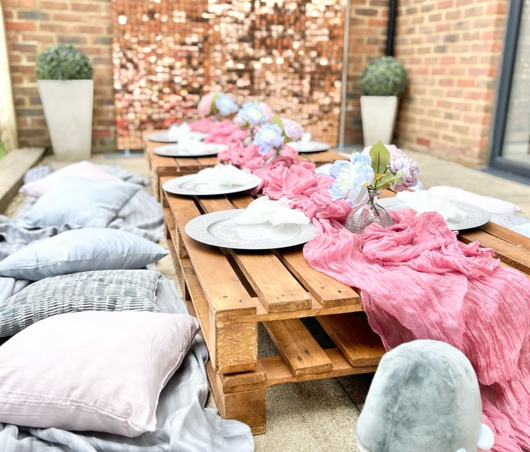 Planning a party? We have a variety of pallet furniture, lawn games, backdrops, and food walls for the perfect garden party.