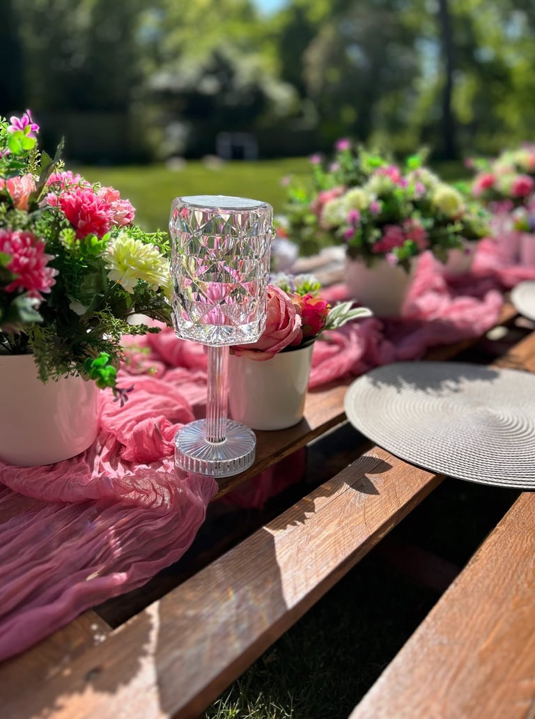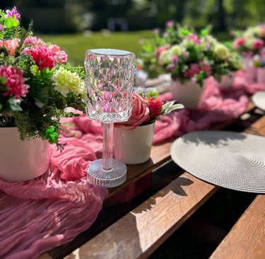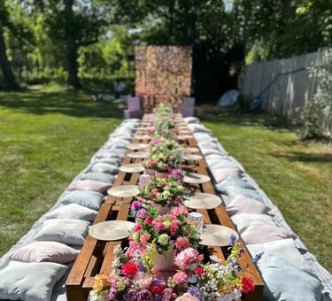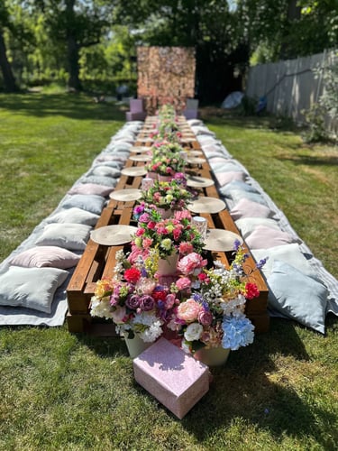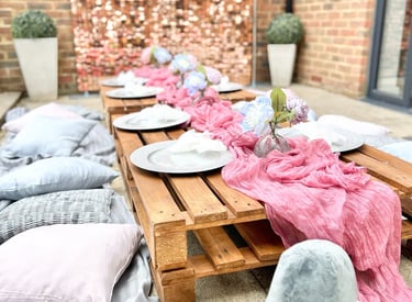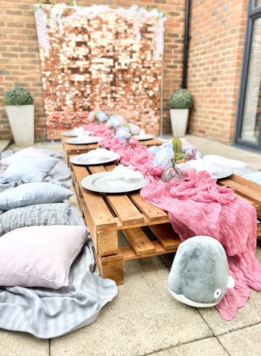 Our handcrafted pallet party tables bring rustic charm and relaxed elegance to any outdoor celebration. Perfect for garden parties, picnics, or boho-themed events, they’re low-set and styled with cozy cushions for a laid-back, intimate vibe. Ideal for birthdays, baby showers, or just a beautiful gathering under the sky.